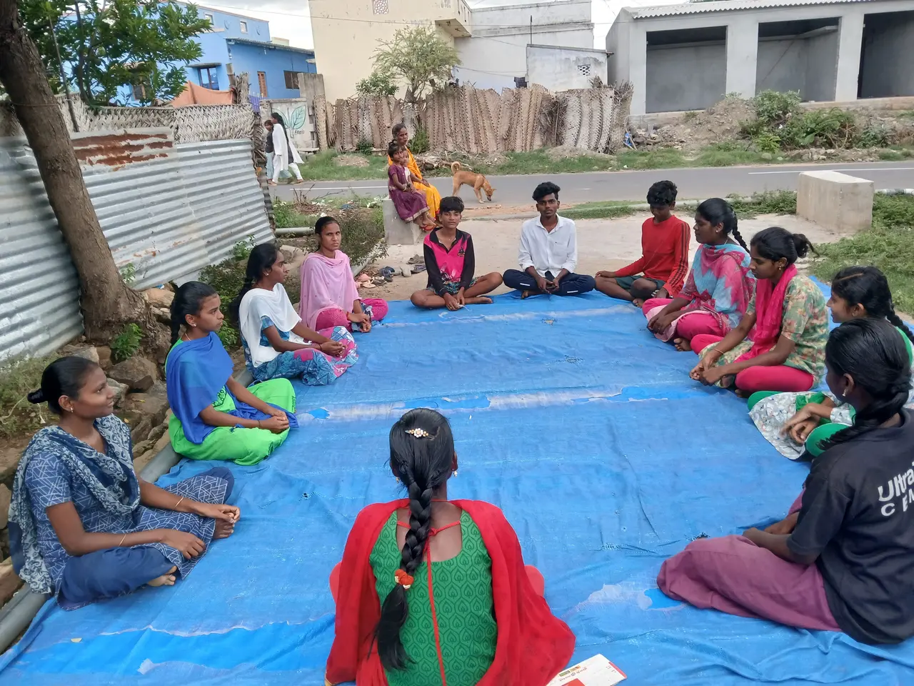 Moonam Palli is one of the target villages of the project “Break the Chain” supported by BMZ to address the issues of labour exploitations and recruitment of adolescent girls in textile supply chain. As part of the project initiative, youth groups were formed and strengthened in all the project target villages. The youth groups in Moonam Palli village emerged as a successful group to solve community issues, one such is ensuring access to education by getting bus shelter to their village through their actions.